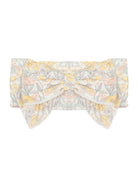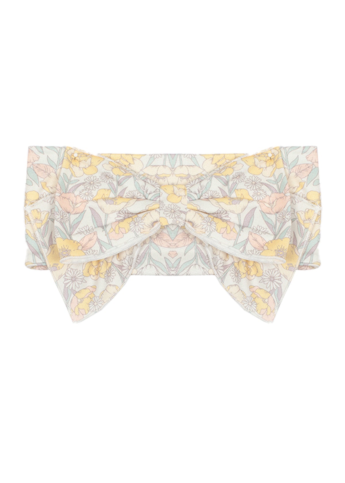 This baby girl romper features a soft, pastel-toned floral print. The ruffle overlay at the chest and flutter sleeves add an elegant, playful detail.