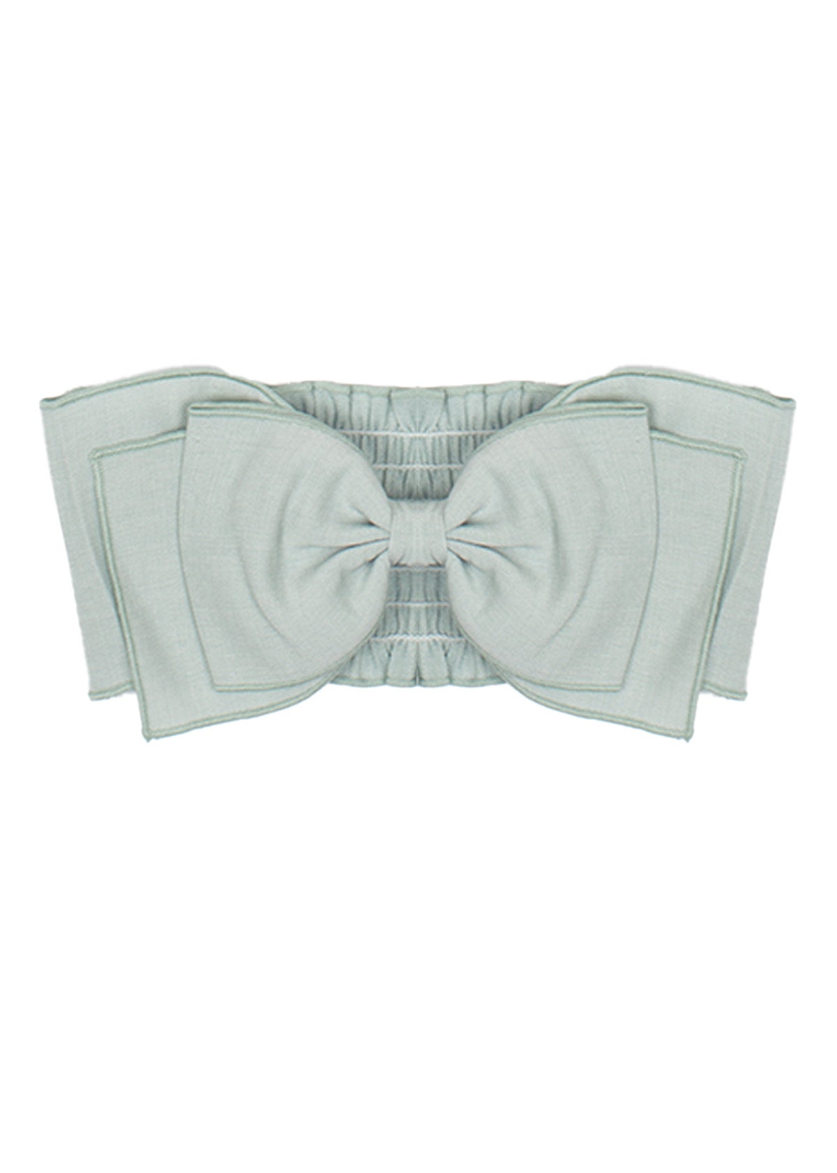 This elegant girl's hair accessory features a large bow in a soft sage green. Crafted with a delicate texture, the bow is set on an elastic band for a secure and comfortable fit.