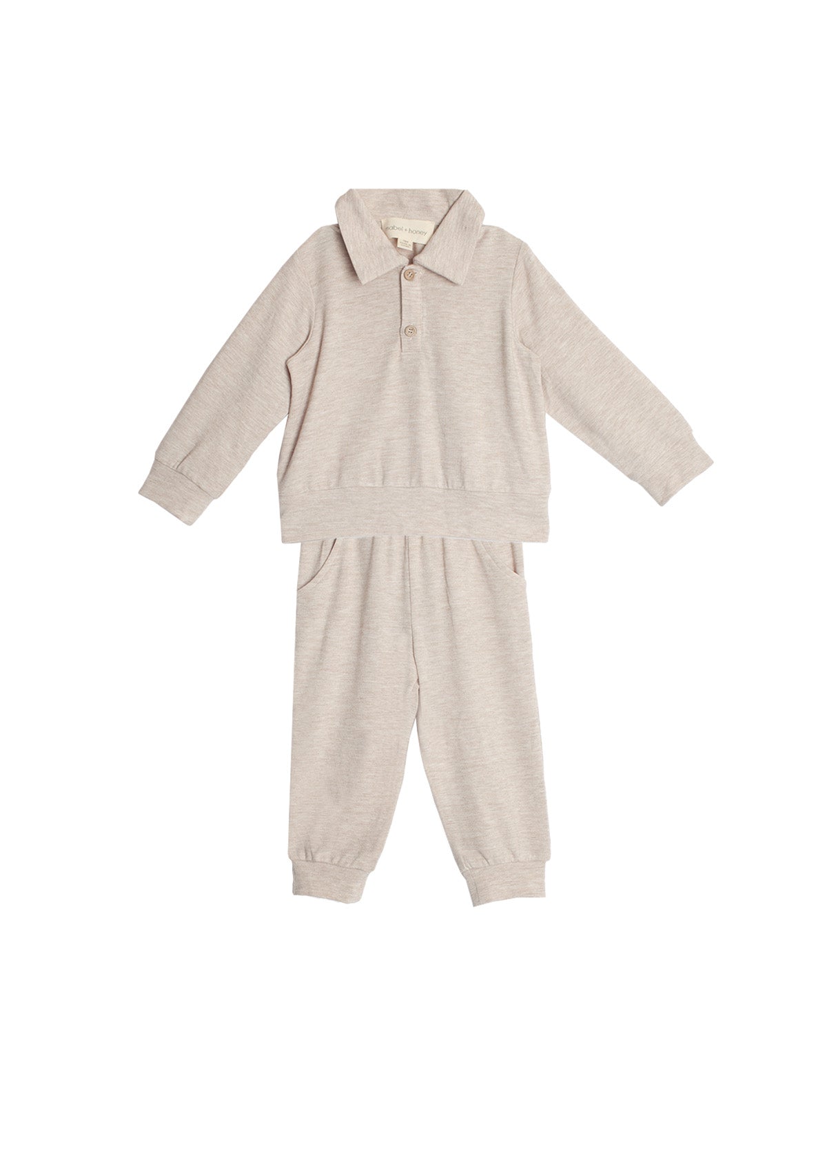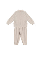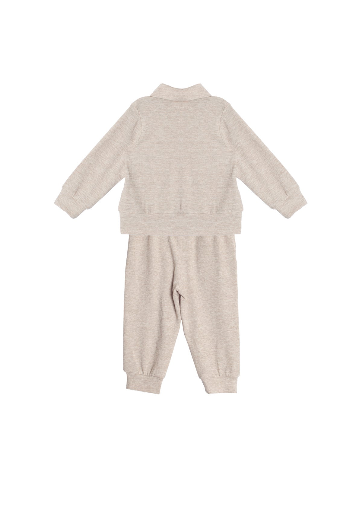 This cozy boys' 2-piece set features a soft, breathable fabric in a neutral beige tone. The set includes a long-sleeve top with a classic collared neckline and a half-zip placket for easy dressing. The matching pants have an elastic waistband and cuffs for a comfortable fit, making this set perfect for casual outings and lounging at home.