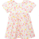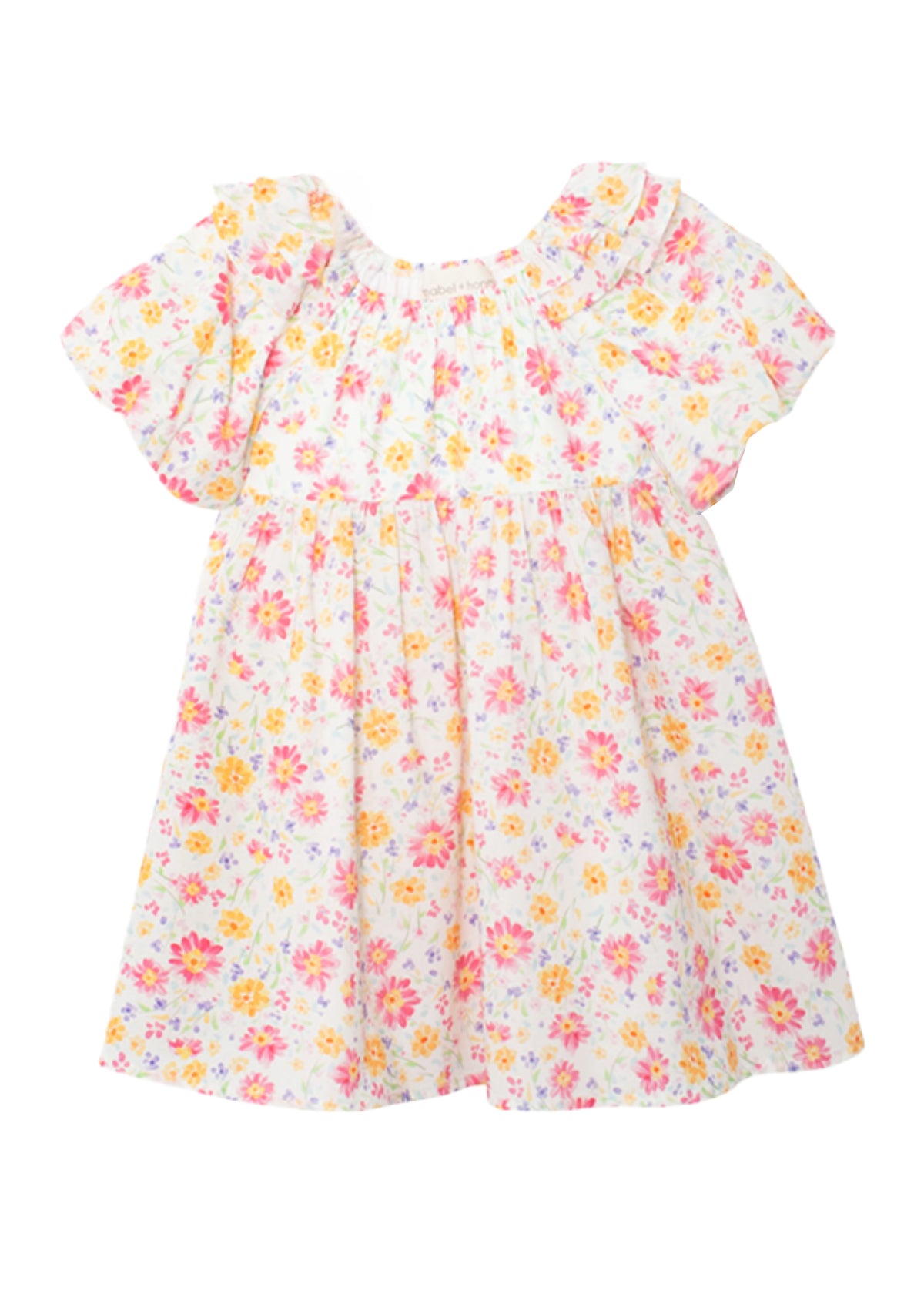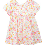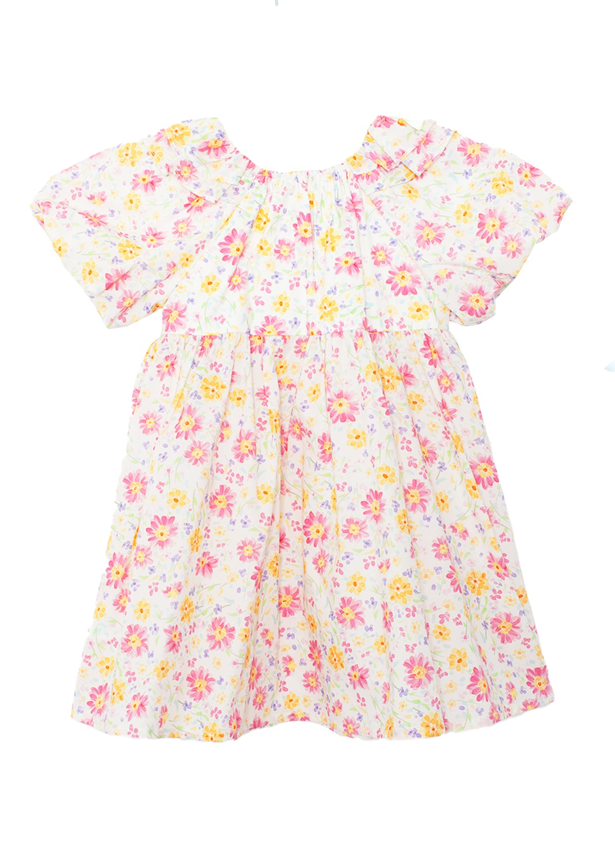 This puff sleeve cotton woven dress features a colorful floral pattern. Designed with a gathered neckline, ruffle details and flowy fit.