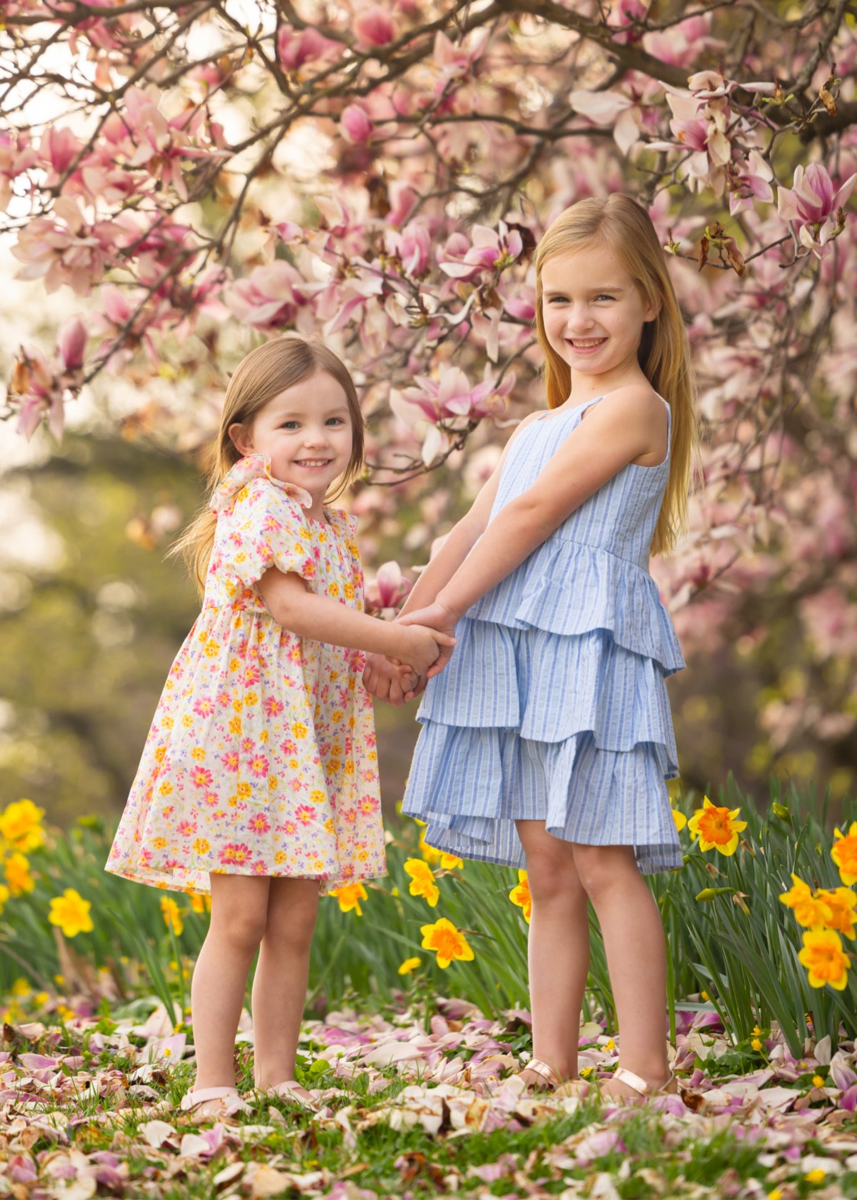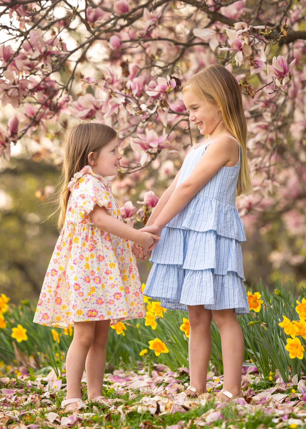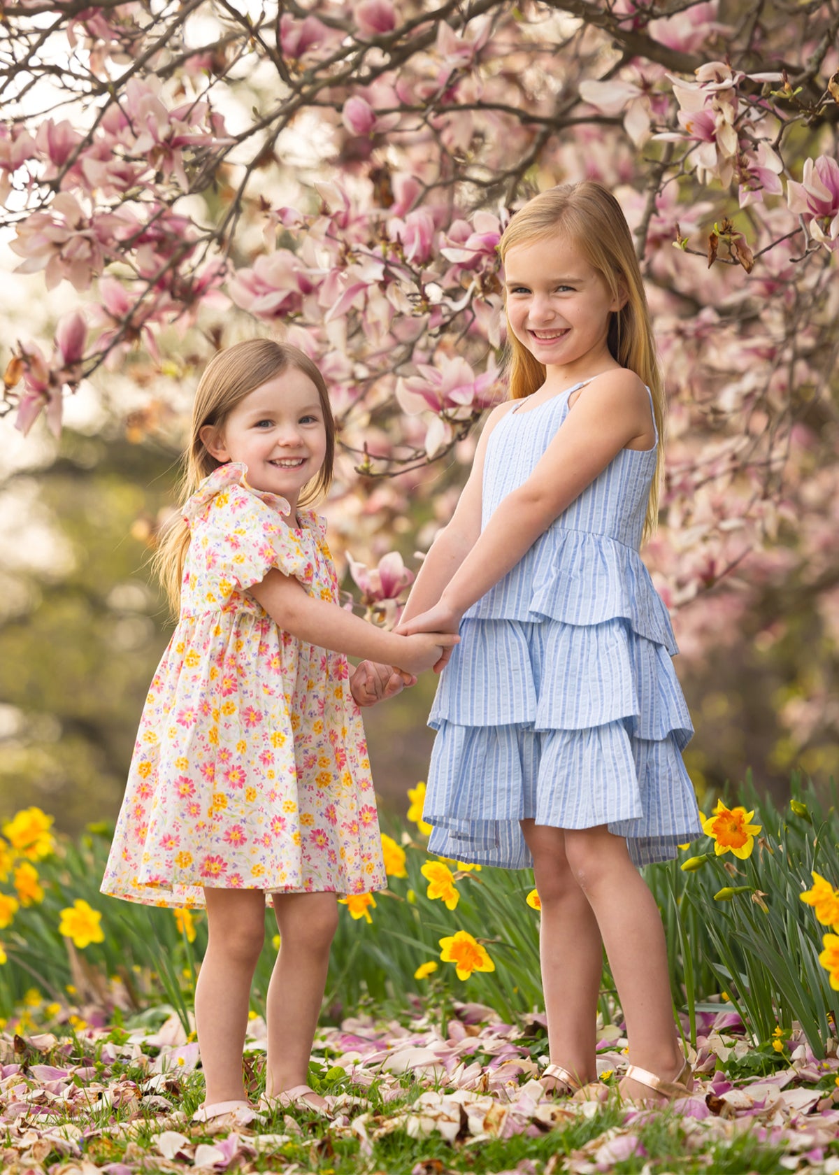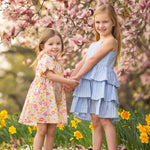 A young girl smiles among blooming pink magnolia flowers on a grassy lawn, wearing the Petal Party Short Bubble Sleeve Dress by Mabel and Honey, surrounded by soft sunlight and vibrant blossoms.