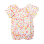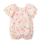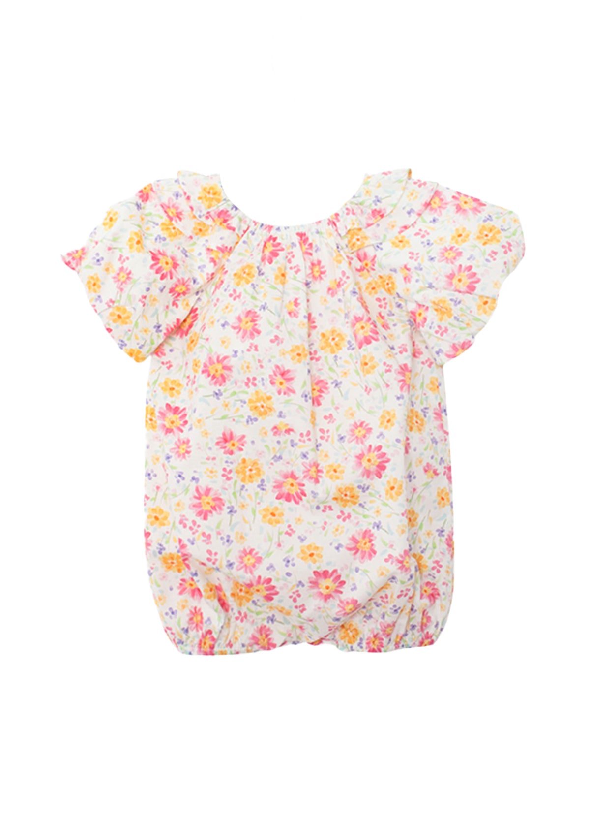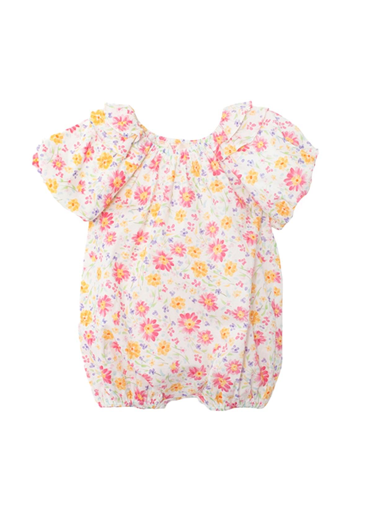 This puff sleeve cotton woven romper features a colorful floral pattern. Designed with a gathered neckline, ruffle details and flowy fit.