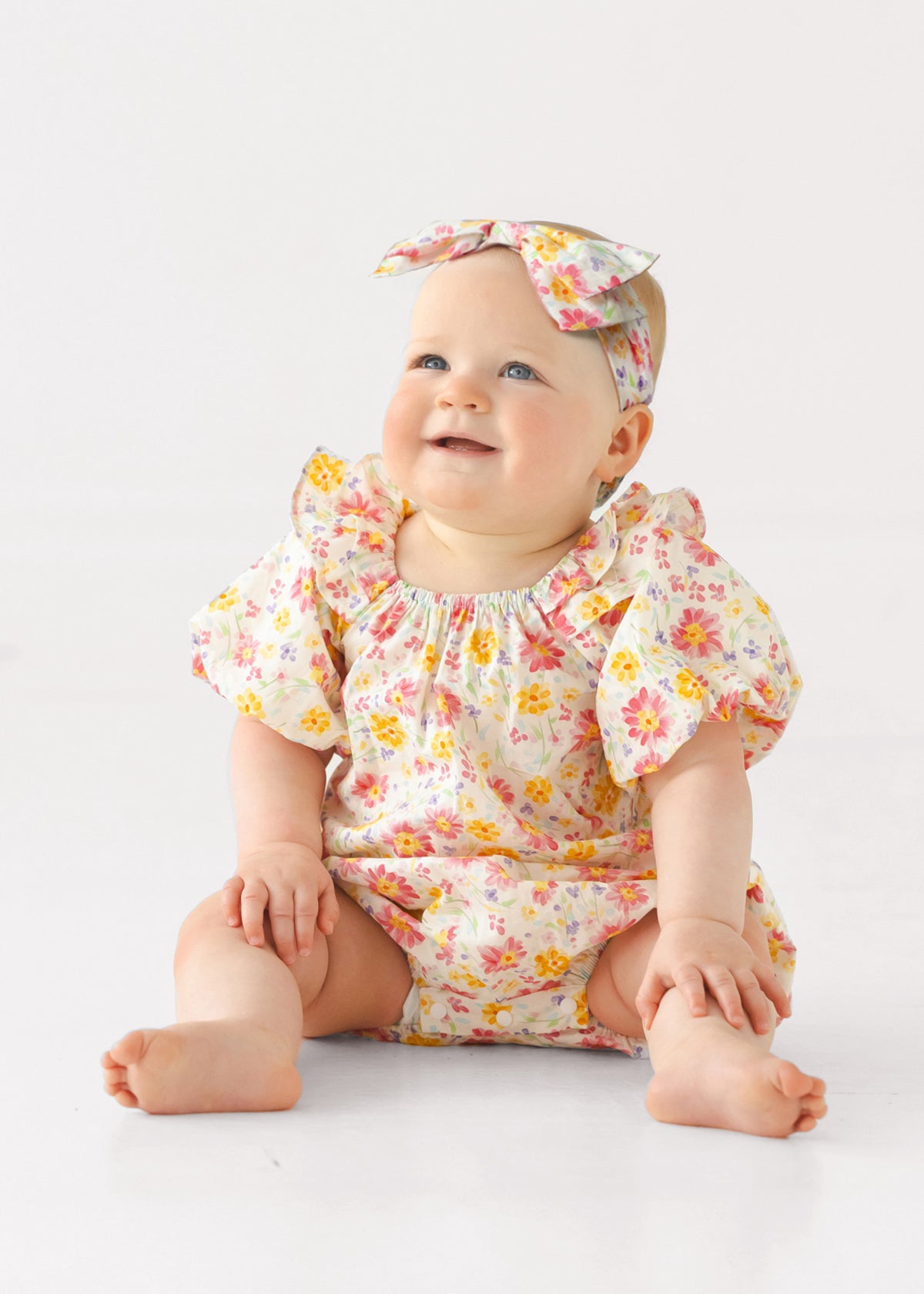 A smiling baby sits barefoot on a white surface, wearing the Mabel and Honey Petal Party Short Bubble Sleeve Romper with floral prints, ruffle details, and a matching headband, against a plain white background.