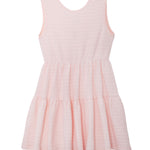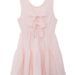 This sleeveless light pink dress features a round neckline and a tiered, gathered skirt for added volume and movement. The subtle horizontal stripe pattern adds texture, while the flared design ensures a comfortable fit. Even more stylish with the back bow detail for a touch of sweetness.