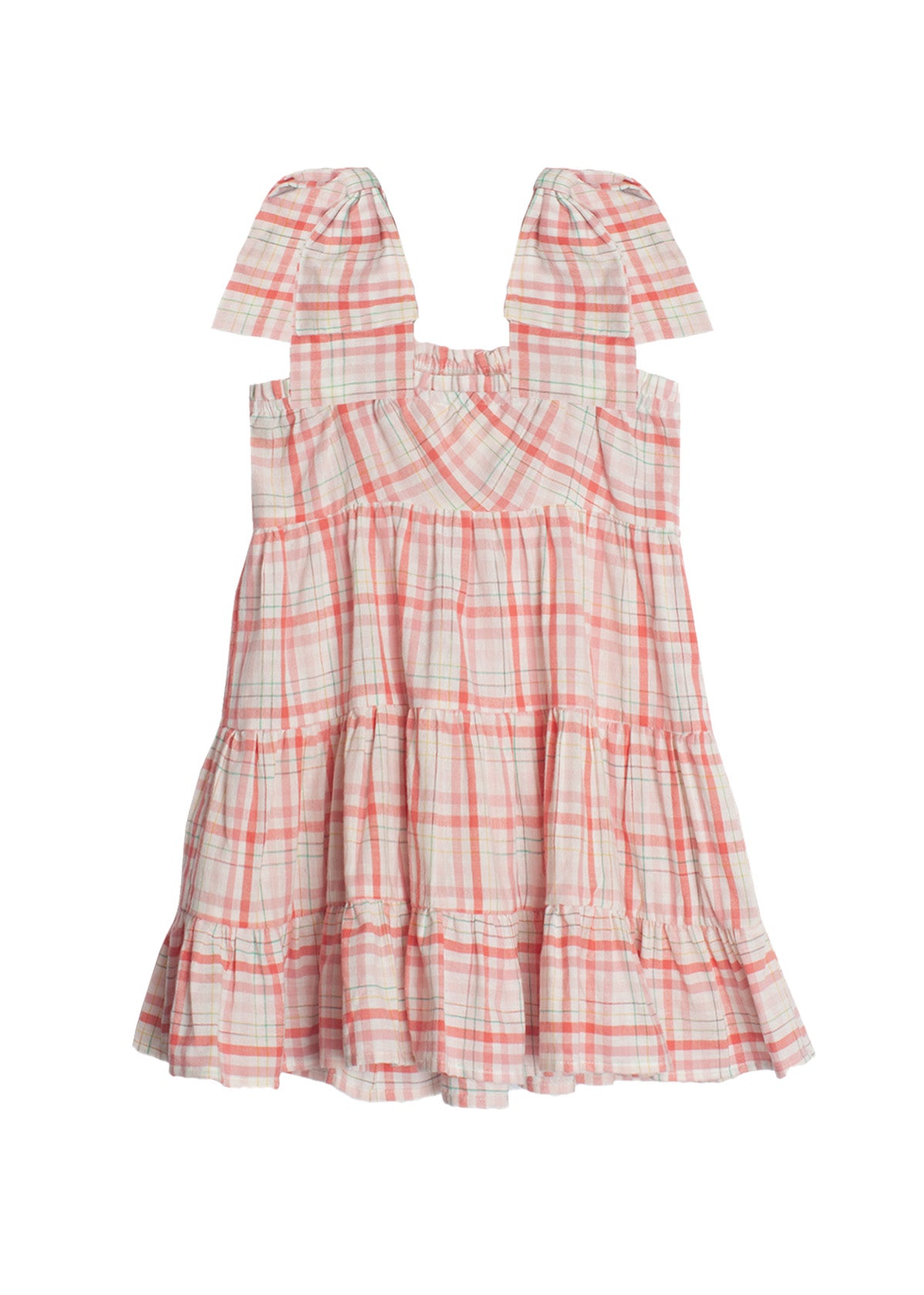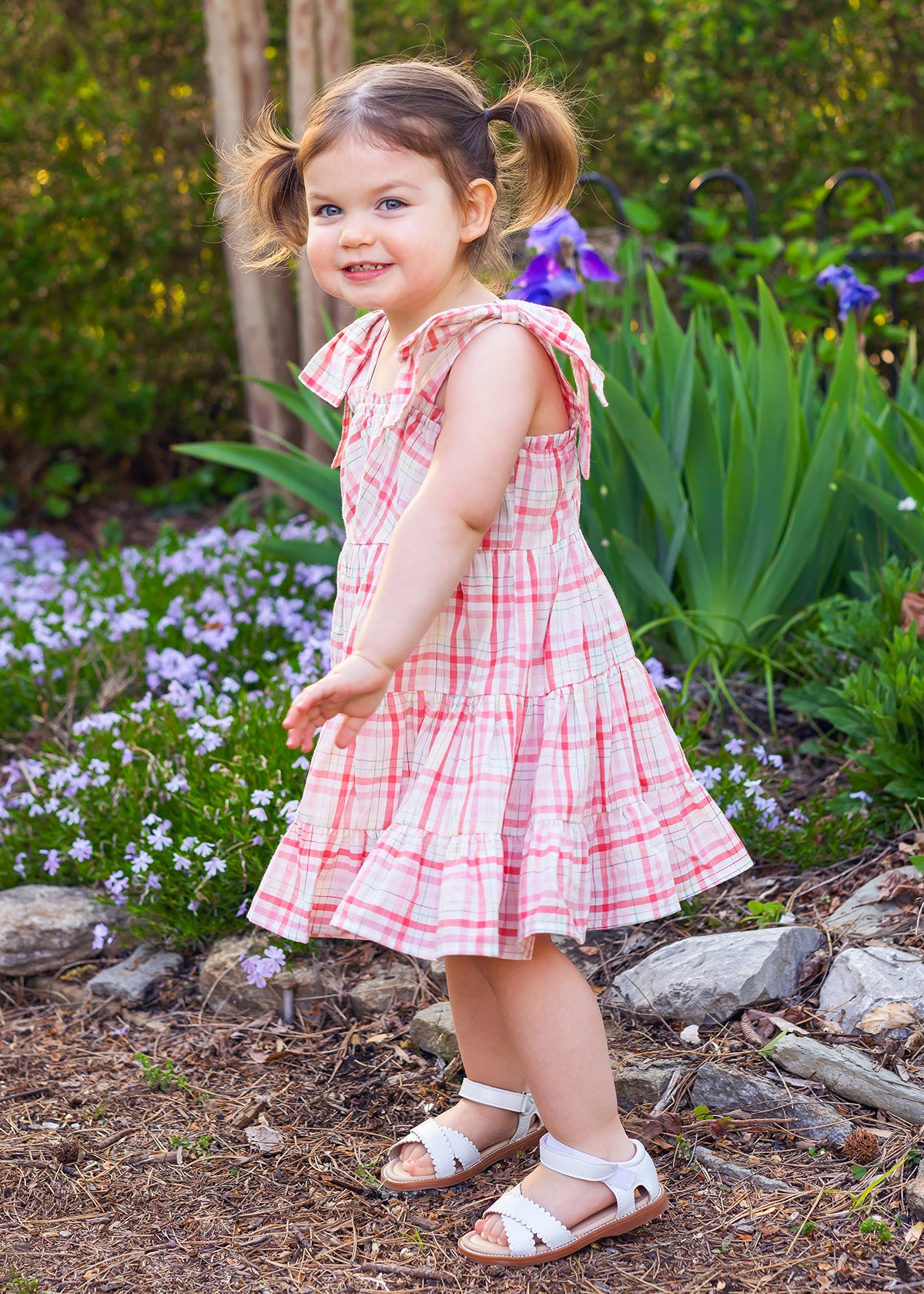 This delightful empire waist dress is a lovely blend of whimsy and casual style, featuring a playful pink and green plaid pattern. Its fluttering sleeves add a touch of sweetness, perfect for summertime adventures. The lightweight cotton fabric ensures comfort, while the tiered ruffles promise fun movement. A charming piece from Mabel and Honey's collection, it captures the joy of youthful dressing.