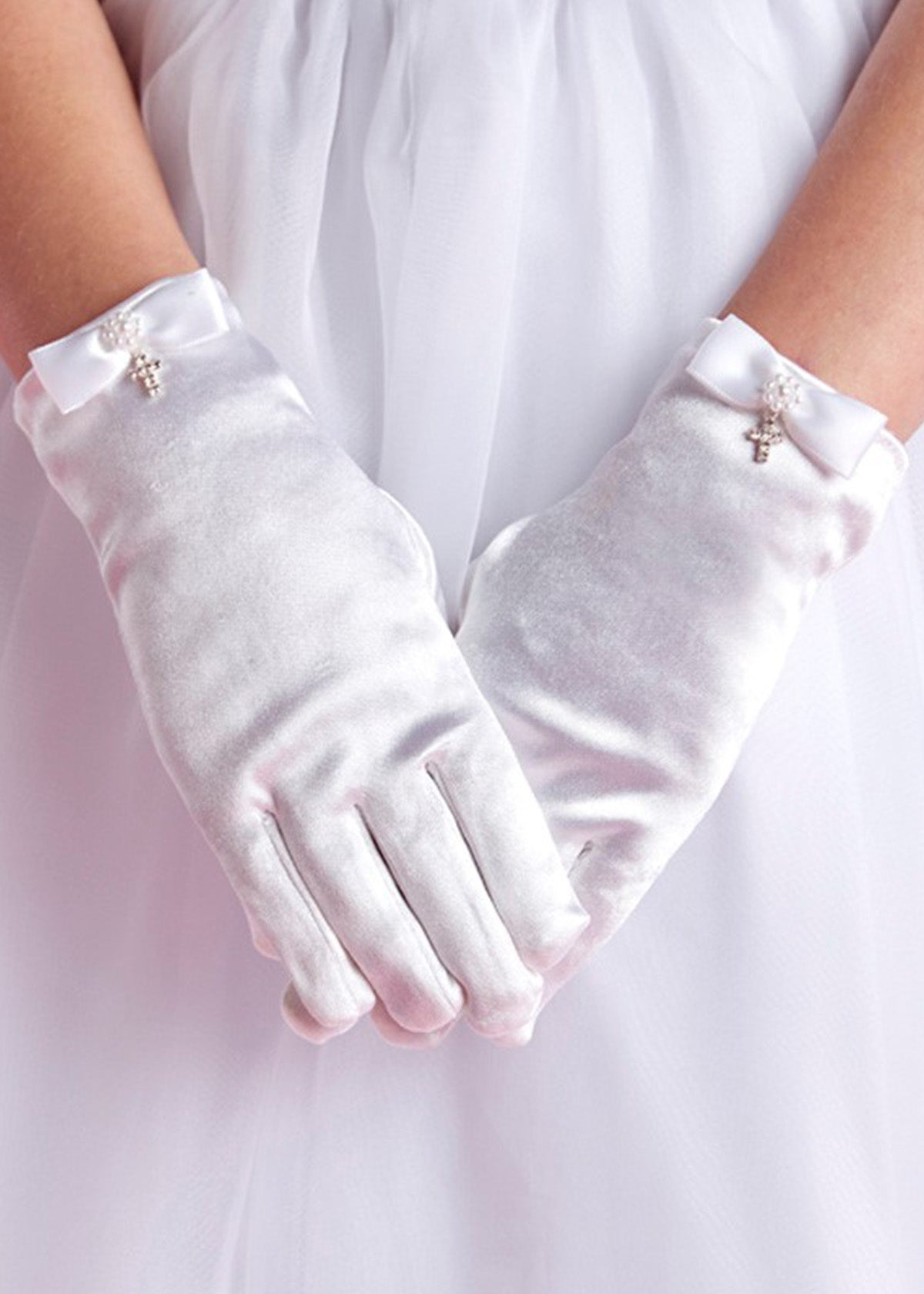 These elegant white satin communion gloves offer a smooth, refined finish with a delicate wrist-length design. Each cuff is adorned with a satin bow, pearl accents, and a small crystal cross charm for a meaningful touch. Designed for comfort and grace, they complete any special occasion ensemble beautifully.