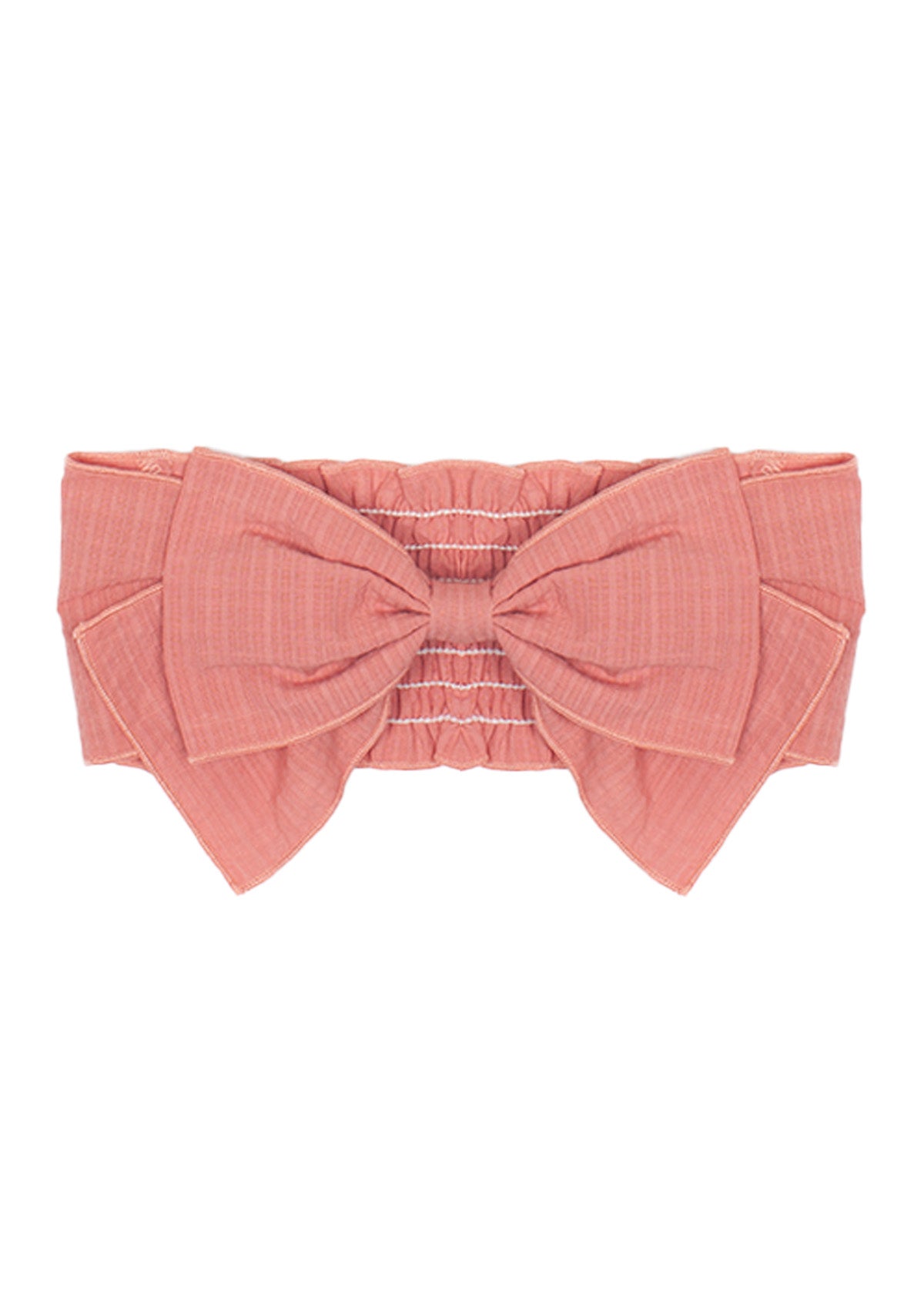 This elegant girl's hair accessory features a large bow in a warm, dusty rose hue. Crafted with a delicate texture, the bow is set on an elasticized band for a secure and comfortable fit.
