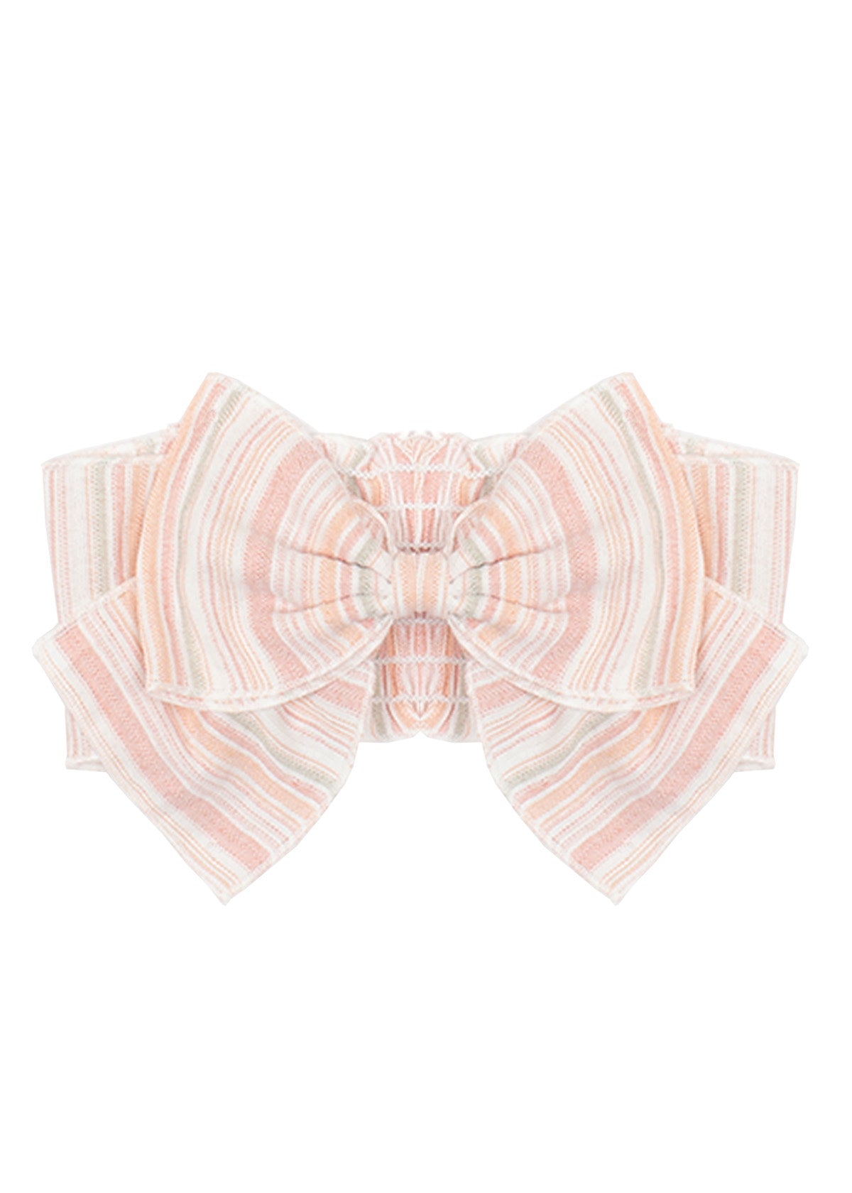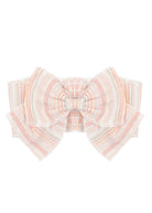 This adorable girl's hair accessory features a large bow adorned with a charming striped pattern in soft shades of pink, peach, and white.