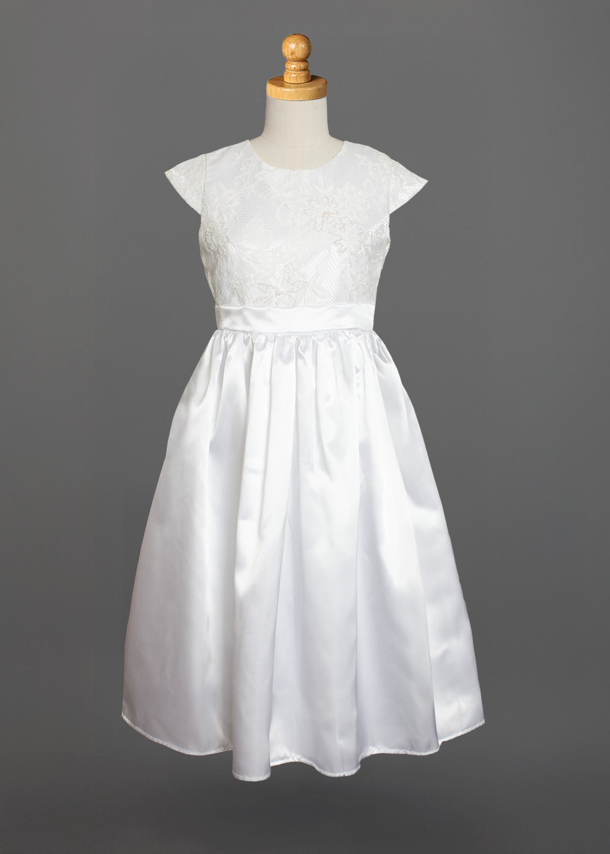 This white communion dress features a delicate lace bodice with intricate floral embroidery and elegant cap sleeves. The satin waistband enhances the design, adding a polished touch. The full satin skirt drapes beautifully, making this dress a sophisticated choice for her special day. Perfect for creating a refined and elegant look.