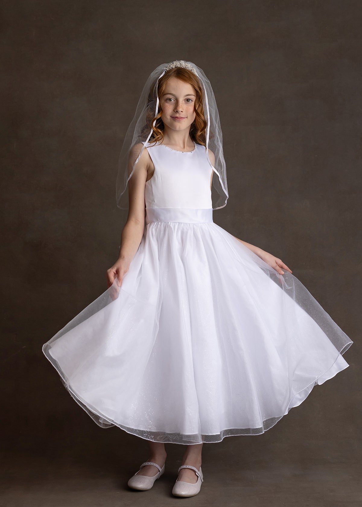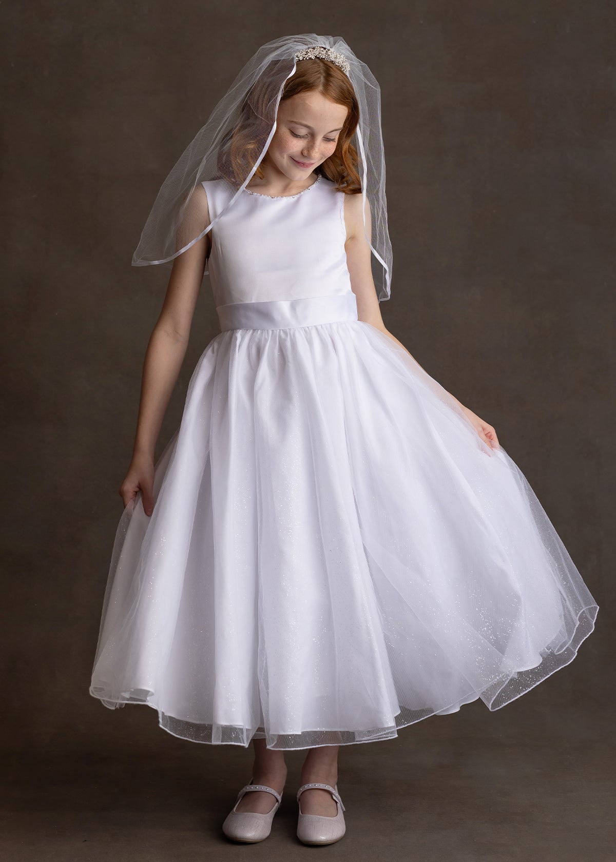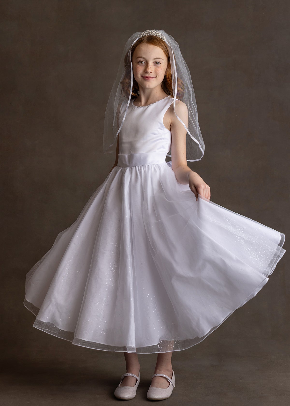 This white communion dress features a satin bodice with a delicate pearl and crystal-accented neckline for a touch of elegance. A smooth satin waistband adds a structured finish, while the glitter tulle skirt sparkles beautifully with every movement. Designed for grace and comfort, it is perfect for a special occasion.