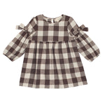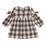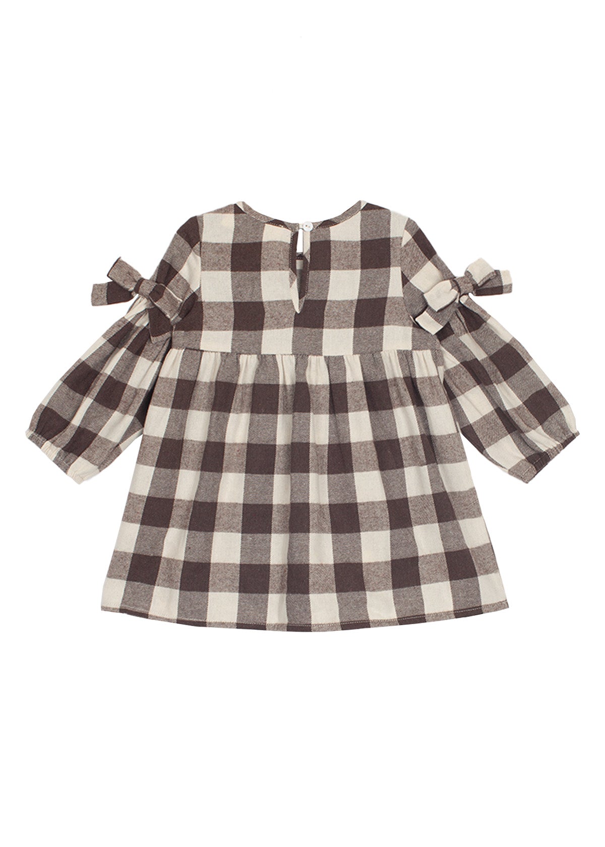 This girl's dress features a classic checkered pattern in deep brown and cream tones. The design is elevated with stylish cold-shoulder cutouts adorned with delicate bow accents. The dress has a relaxed, A-line silhouette, making it both comfortable and chic, perfect for fall outings or casual gatherings.