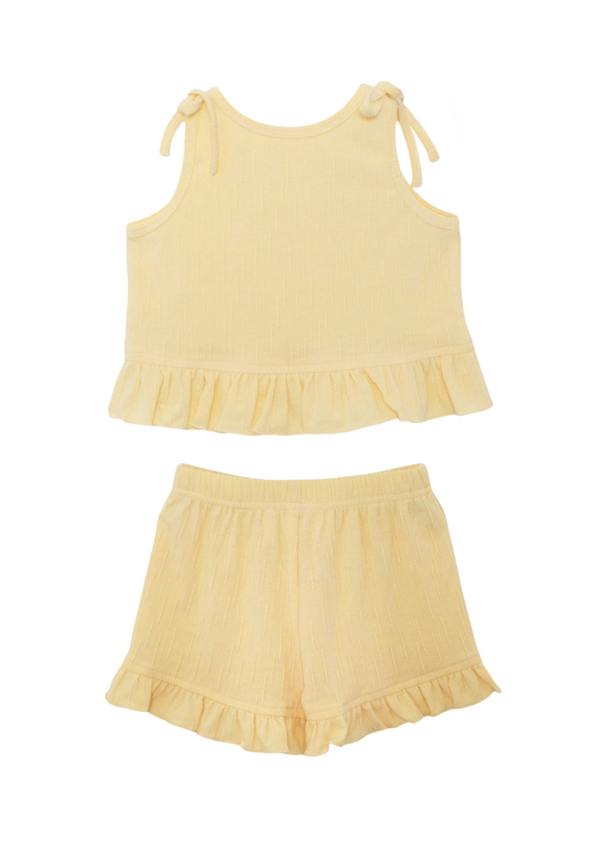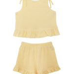 Prepare for warm days with this bright and breezy outfit. Made from a soft, textured knit, this set keeps little ones comfortable during play. The light yellow sleeveless top features bow details on the shoulder and shorts have a ruffled hem. Perfect for every summer adventure.