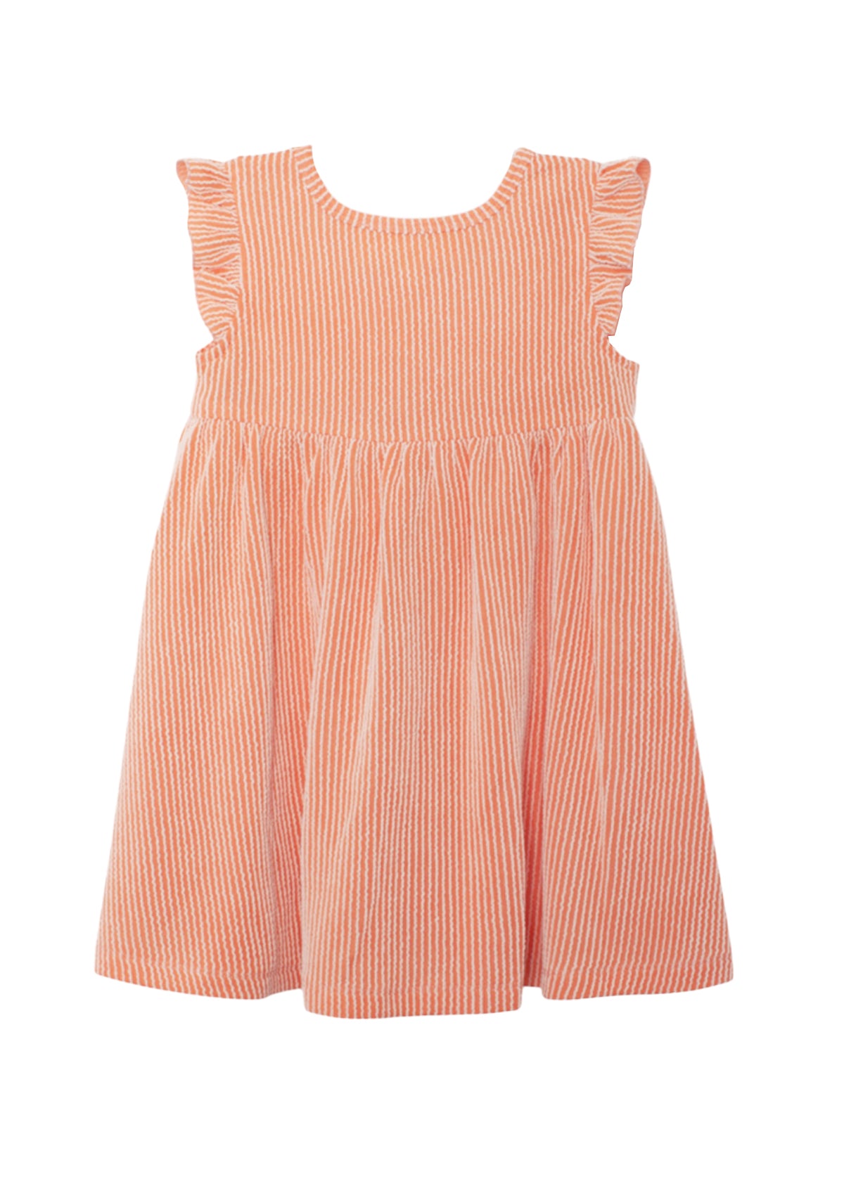 This orange and white striped dress features a soft, textured knit fabric perfect for warm weather. Designed with flutter sleeves, a gathered waistline, and a flared skirt, it offers a playful yet elegant silhouette.