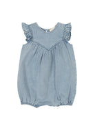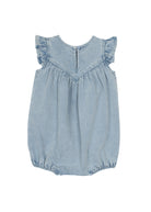 This soft stretchy blue denim romper features ruffled flutter sleeves and a gathered v-shaped yoke added detail. Perfect for everyday wear, it combines style and ease for little ones.