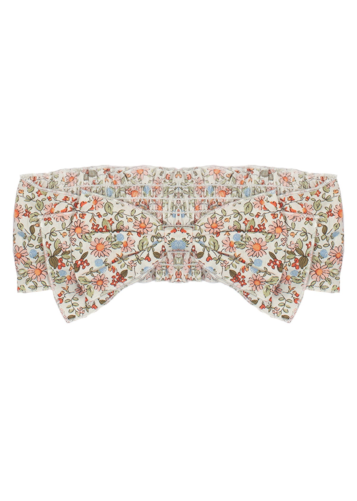 This baby romper showcases a colorful botanical print in soft orange, green, and blue tones on a cream background. Designed with ruffled flutter sleeves and a gently gathered yoke, it offers a relaxed, airy fit, making it ideal for warm-weather outings or playtime.