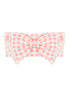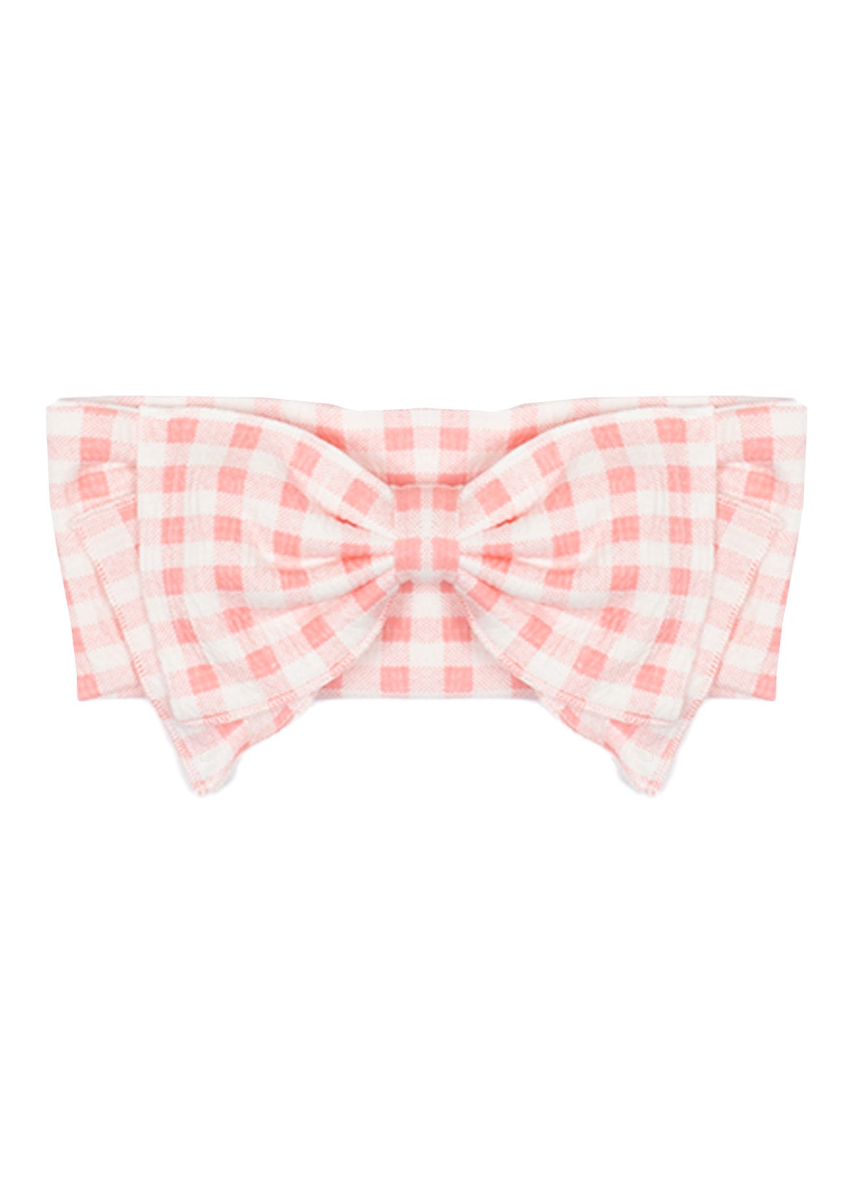 This charming girl's hair accessory features a large bow adorned with a classic pink and white gingham pattern. The bow is set on an elasticized band for a secure and comfortable fit. Perfect for adding a touch of timeless elegance to any outfit, this accessory is ideal for both everyday wear and special occasions.