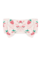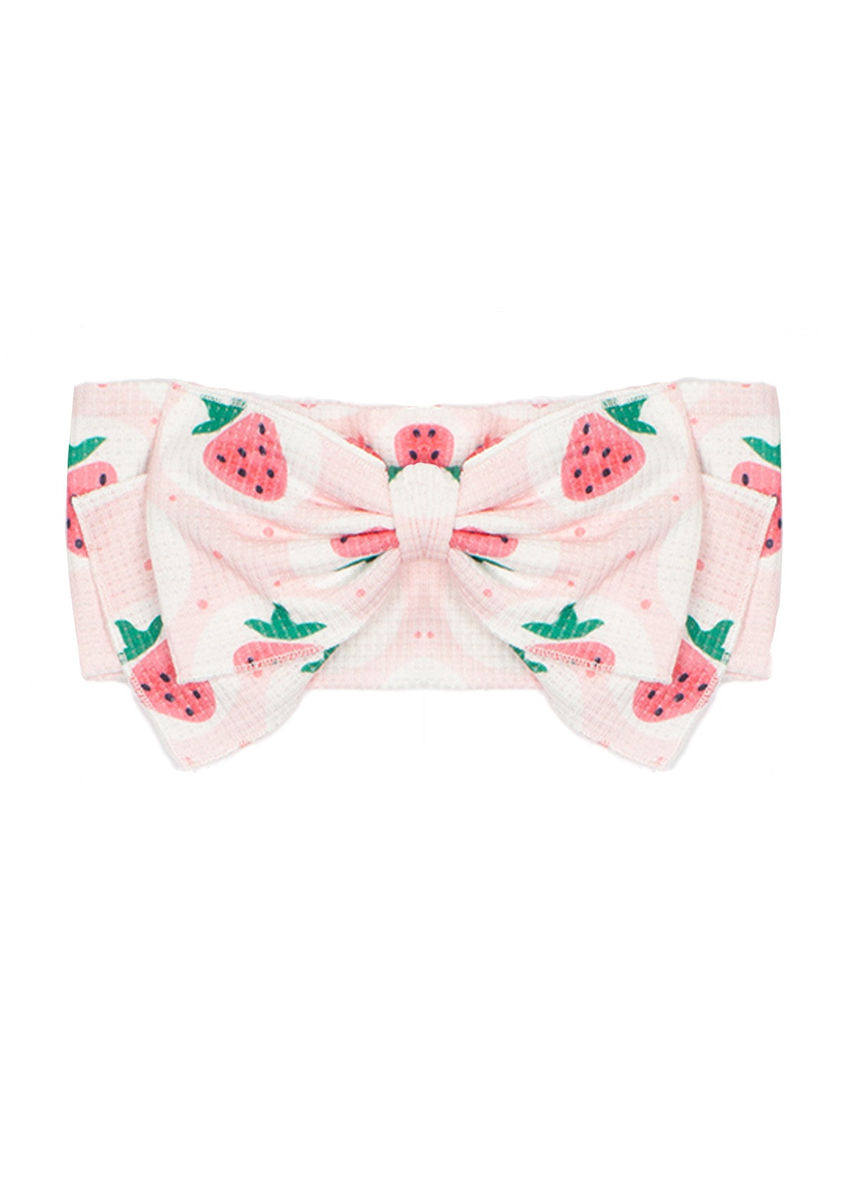 This adorable girl's hair accessory features a large bow adorned with a playful strawberry print in vibrant shades of pink and green. The bow is set on an elasticized band for a secure and comfortable fit. Perfect for adding a touch of fun and whimsy to any outfit, ideal for everyday wear or special occasions.